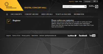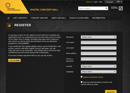 Der Bildschirm mit der Registrierung für den “Digital Concert Hall” erscheint. Klicken Sie auf “JETZT REGISTRIEREN”.